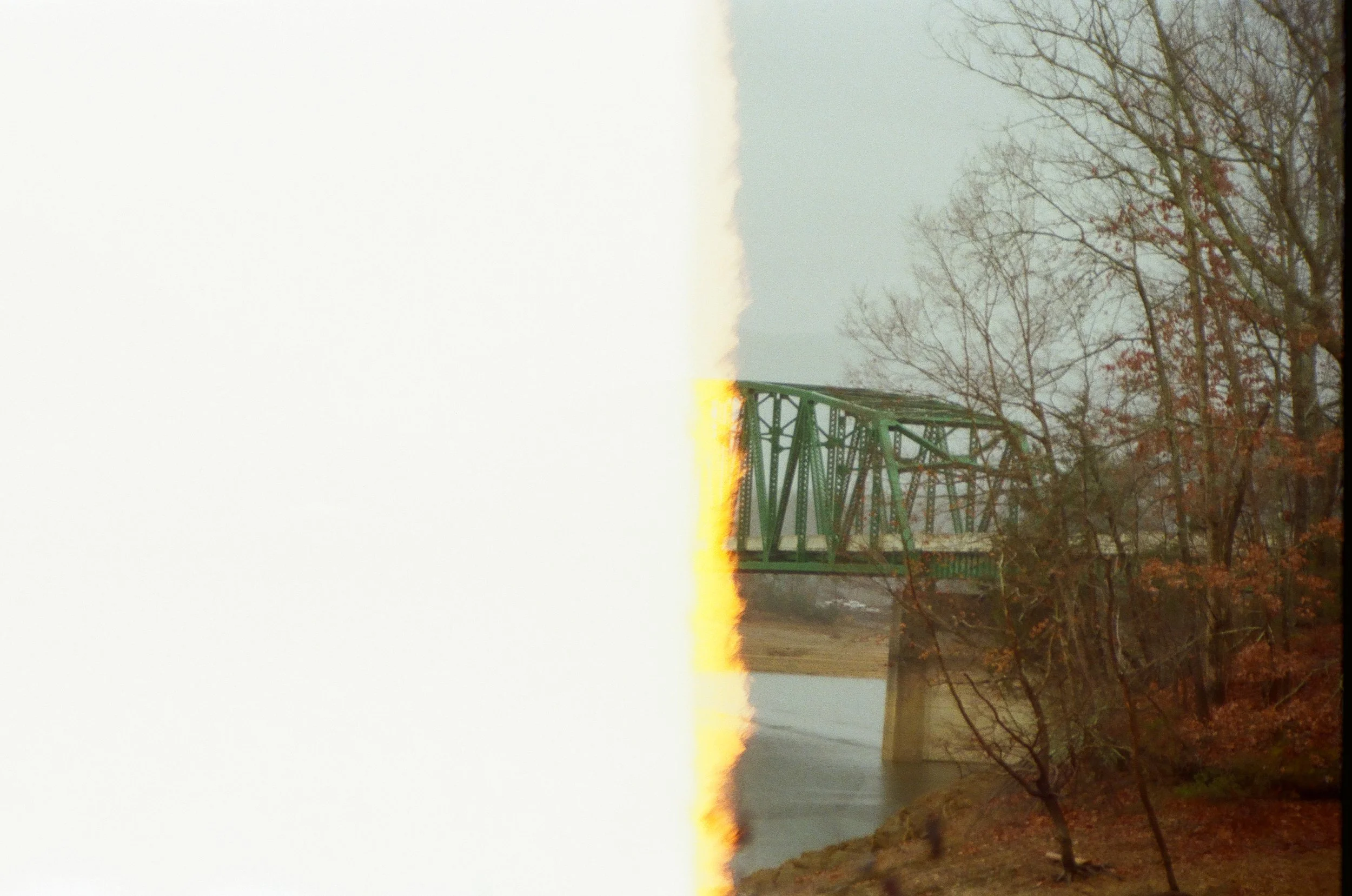 Light leaks and water damage, from a canoeing accident. This photo teaches us a lot about the photographic process. Film itself makes images by an emulsion of chemicals reacting to light. If at any point the film is exposed to light, that light will react with the film. Rather than making a specific image, as if shot properly, the volume and intensity of direct sunlight completely blows out the film. In essence, the camera itself is merely a device that limits and focuses the light we perceive. When we flipped out of the canoe and I found myself swimming, the film was also completely washed out with river water, leading to the more visible blue streaks. After resurfacing I opened the camera back to drain the water, which annihilated about 5 or 6 images fully, yet only partially altered this one, making it the perfect example for study.